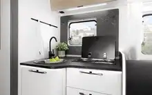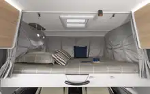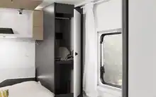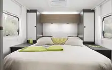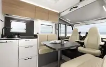 El interior se distingue por su altura útil de 2,10 m y su diseño moderno con acabados de calidad. En la parte trasera incorpora una cama en isla de 198 x 148 cm, que proporciona comodidad y accesibilidad desde ambos lados. Además, cuenta con una cama abatible delantera (193 x 150 cm) y una cama central opcional (195 x 90 cm), alcanzando hasta cinco plazas para dormir.