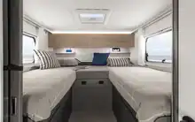 El interior destaca por su diseño ergonómico y luminoso, con una distribución pensada para cuatro personas y capacidad de hasta cinco plazas para dormir. Incorpora dos camas individuales traseras (210 x 80 cm y 205 x 80 cm) convertibles en una gran cama doble de 210 cm de ancho, una cama abatible delantera (193 x 150 cm) y una cama central opcional (200 x 60 cm).