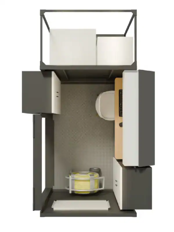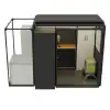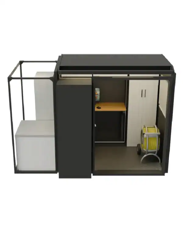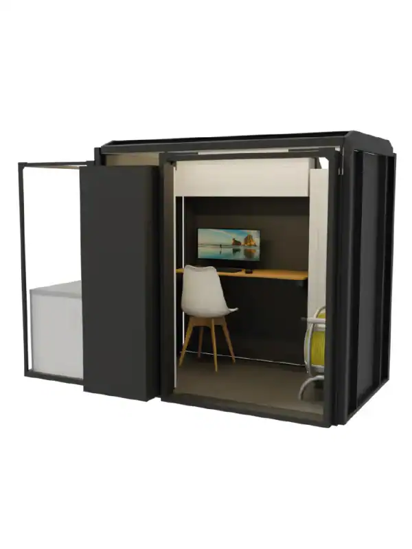 Además, sus materiales son resistentes, ligeros y sostenibles, permitiendo un equilibrio perfecto entre durabilidad y estética. Su sistema modular permite personalizar el interior según las necesidades del usuario: desde una zona de reuniones, hasta una estación de trabajo individual, o incluso un setup híbrido para videollamadas y edición de contenido.