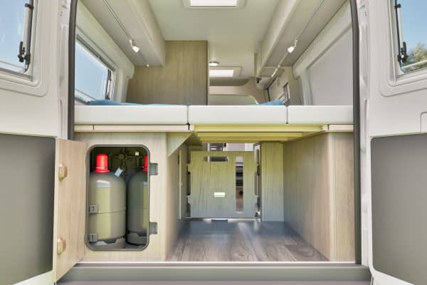 Autonomía real para varios días: 100 l de agua limpia con limitación de 20 l en marcha, 90 l de grises, calefacción Combi 4 Gas y 2 bombonas de 11 kg.