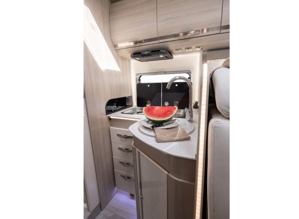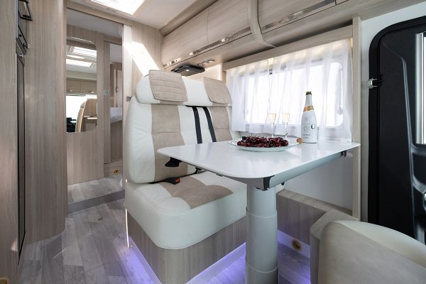 La autocaravana 740 XMK es un vehículo semi-integral que se caracteriza principalmente por ofrecer una distribución interior muy variable. Este modelo permite la opción de incluir una cama elevable así como una quinta plaza en carretera. Es perfecta para parejas, pero también para familias o grupos de amigos de hasta cinco personas. Es la autocaravana más práctica y versátil de entre todos los modelos Ilusion.