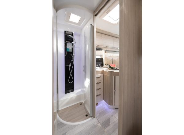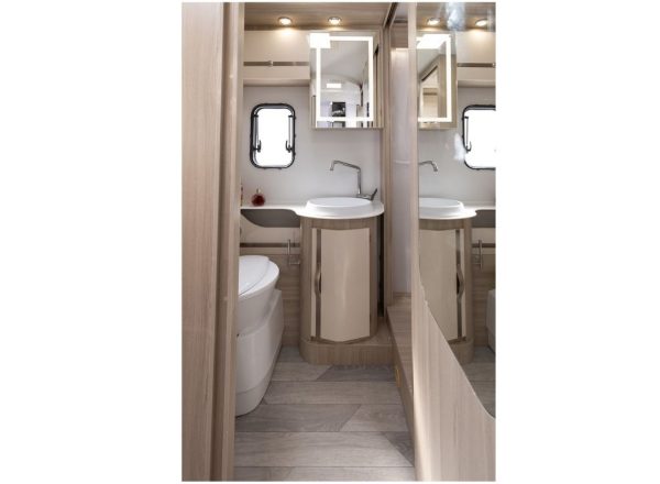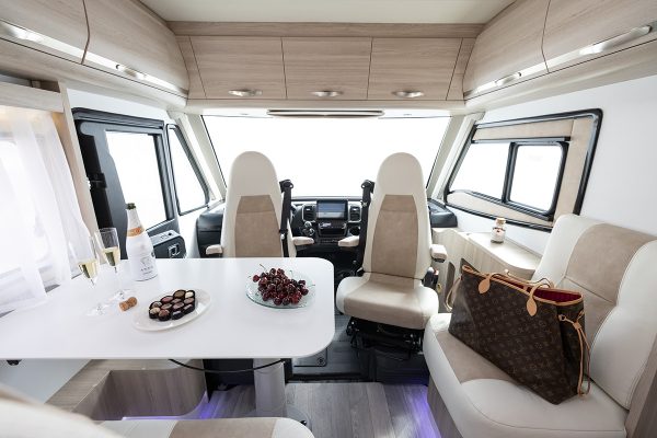 Con una gran cama de matrimonio en la parte posterior, la Ilux I7QB destaca por sus ambientes amplios y acogedores, con una mezcla de materiales de alta calidad y diseño moderno en tonos naturales y coordinados que invitan a disfrutar de cada momento.