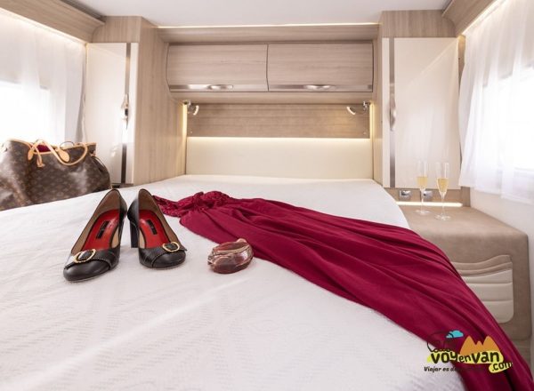 4 asientos homologados y 4 plazas para dormir*. El vehículo tiene cama doble fija en la parte trasera